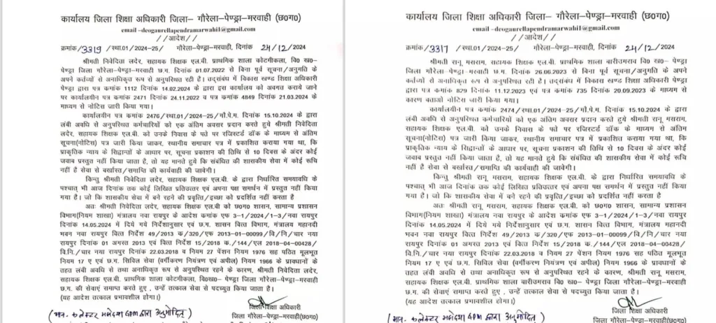 बता दें कि जिला शिक्षा अधिकारी द्वारा बीते 24 दिसंबर को जारी आदेश में स्पष्ट किया गया कि इन कर्मचारियों ने बिना पूर्व सूचना और अनुमति के अपने कर्तव्यों से अनाधिकृत अनुपस्थिति दर्ज की। इसके साथ ही उन्हें अंतिम अवसर प्रदान करते हुए 10 दिन के भीतर जवाब प्रस्तुत करने का निर्देश दिया गया था। बता दें कि इन कर्मचारियों ने 10 दिनों तक कोई उत्तर नहीं मिलने की वजह से अब नवा रायपुर स्थित सामान्य प्रशासन विभाग (नियम शाखा) के निर्देशानुसार, इन कर्मचारियों की सेवाएं समाप्त कर दी है और उन्हें तत्काल पदमुक्त कर दिया गया है।