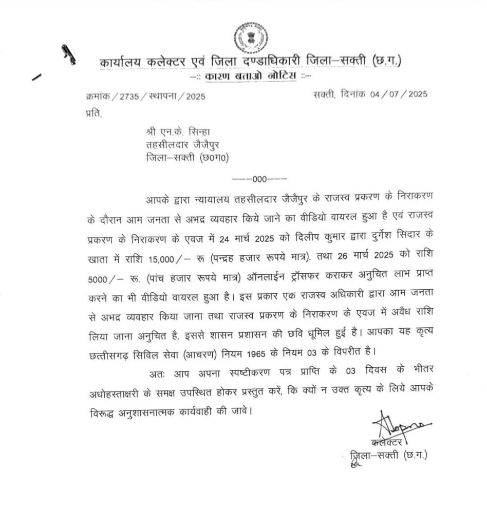 सक्ती। जमीन विवाद से जुड़े एक मामले के निपटारे के लिए तहसीलदार के अपने ड्राइवर के फोन पे पर रिश्वत लिए जाने का वीडियो वायरल हुआ था. लल्लूराम डॉट कॉम में खबर के प्रकाशन के बाद कलेक्टर अमृत विकास तोप्नो ने तहसीलदार को नोटिस जारी कर तीन दिनों के भीतर जवाब मांगा है।