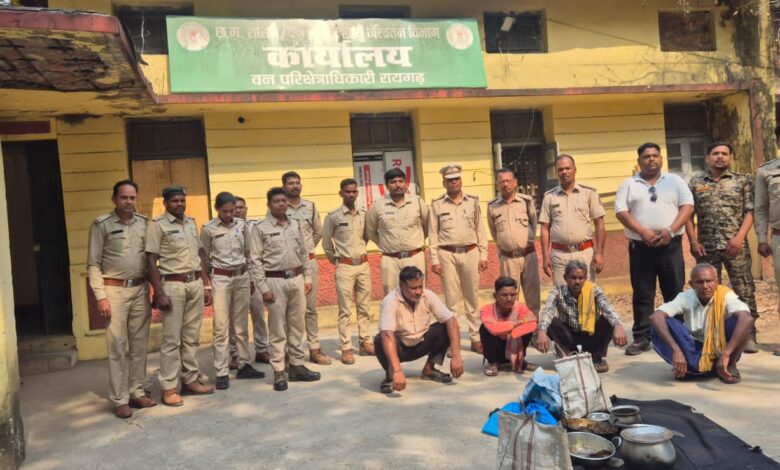 छत्तीसगढ़ के रायगढ़ जिले के देलारी गांव (रायगढ़ रेंज) में वन विभाग ने एक बड़ी कार्रवाई करते हुए सांभर (वन्य प्राणी) का मांस पकाते हुए 4 आरोपियों को गिरफ्तार किया है।