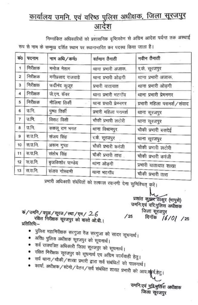 सूरजपुर।पुलिस विभाग में थाना प्रभारियों का तबादला किया गया है. सूरजपुर एसपी प्रशांत ठाकुर ने कानून व्यवस्था में कसावट लाने कई टीआई को इधर से उधर किया है।