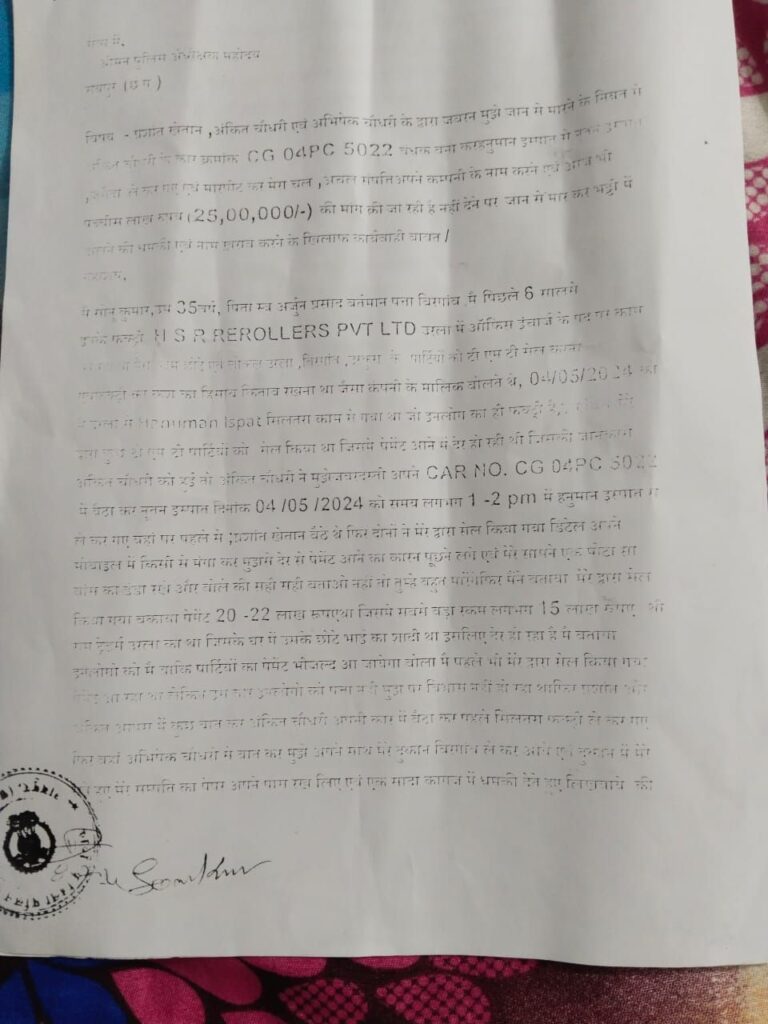 उरला।यह वक्तव्य सोनू कुमार द्वारा आज प्रेस वार्ता के माध्यम से जारी की गई जिसमें सोनू कुमार ने बताया कि पिछले छै साल से एच एस आर प्रा लि उरला में आफिस इंचार्ज के पद पर कार्यरत था इस दौरान प्रशांत खेतान अंकित चौधरी एवं अभिषेक चौधरी के द्वारा मुझे जान से मारने की घमकी दी जा रही है और प्रताड़ित किया जा रहा है मेरी निजी जमीन पर कब्जा कर डरा धमकाकर फर्जी रजिस्ट्री करा ली गई है प्रशांत खेतान एवं अभिषेक के द्वारा अंकित चौधरी की कार क्र CG 04 PC 5022 में मुझे बंधक बनाकर हनुमान इस्पात से नूतन इस्पात ले जा कर मार पीट की गई मेरा चल अचल संपत्ति अपने कम्पनी के नाम करा ली।