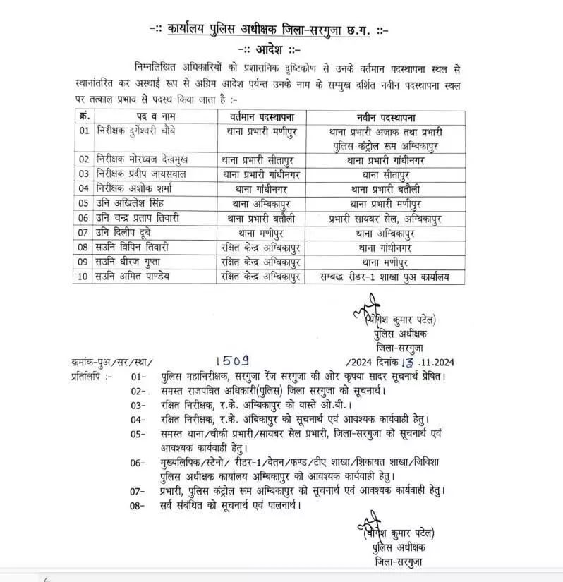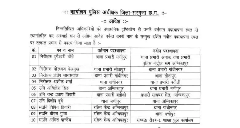 छत्तीसगढ़। अंबिकापुर में पुलिस विभाग में तबादला किया गया है। जारी आदेश के अनुसार यहां तीन नगर निरीक्षक TI, तीन सब इंस्पेक्टर, और तीन असिस्टेंट सब इंस्पेक्टर का तबादला आदेश जारी किया गया। यह आदेश सरगुजा एसपी योगेश पटेल ने जारी किया है।