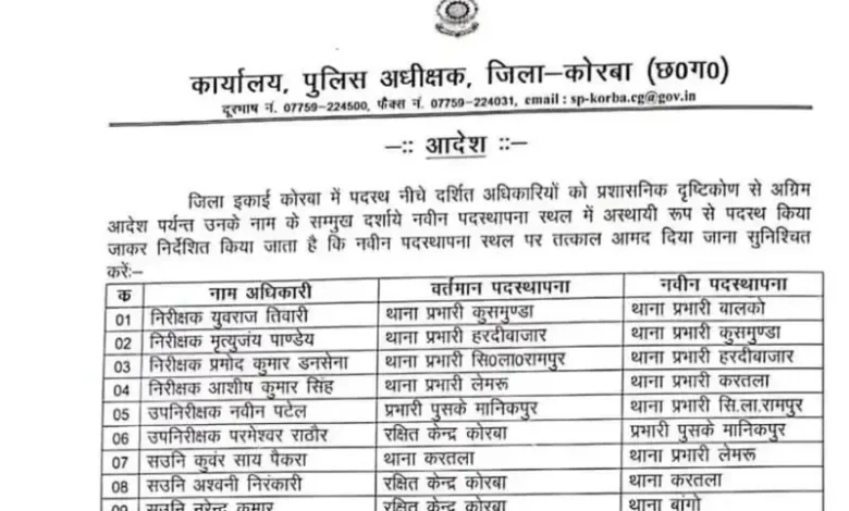 जारी आदेश के अनुसार कुसमुंडा थाना प्रभारी निरीक्षक युवराज तिवारी को बालको नगर थाना प्रभारी के रूप में पदस्थ किया गया है। वहीं मृत्युंजय पांडे को कुसमुंडा थाना का नया प्रभारी बनाया गया है। इसी क्रम में आशीष कुमार सिंह को करतला थाना प्रभारी की जिम्मेदारी दी गई है, जबकि प्रमोद कुमार डडसेना को हरदी बाजार थाना प्रभारी नियुक्त किया गया है। इसके अतिरिक्त जिले में दो उप निरीक्षक (एसआई) एवं तीन सहायक उप निरीक्षक (एएसआई) की पदस्थापना में भी बदलाव किया गया है। पुलिस विभाग के अनुसार यह फेरबदल अपराध नियंत्रण, बेहतर निगरानी और आम जनता को त्वरित न्याय व सुरक्षा उपलब्ध कराने के उद्देश्य से किया गया है फेरबदल की विस्तृत सूची विभाग द्वारा जारी कर दी गई है।