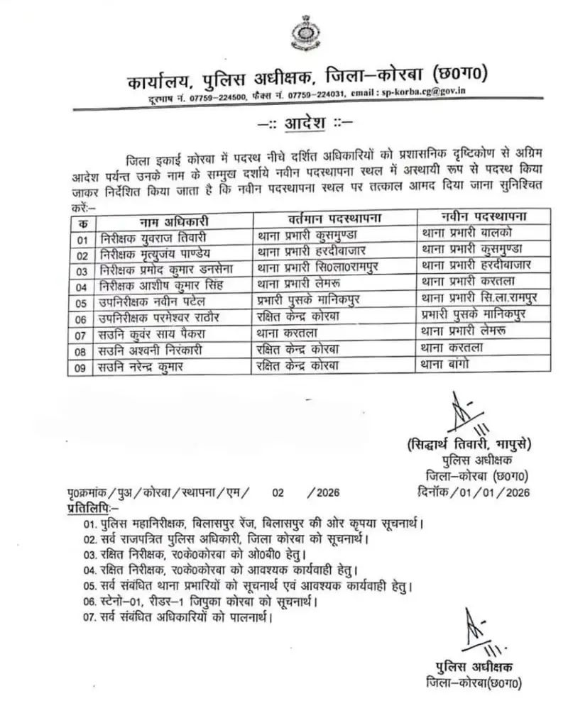 कोरबा।नए साल की शुरुआत के साथ ही कोरबा जिले के पुलिस महकमे में प्रशासनिक स्तर पर बड़ा फेरबदल किया गया है। जिला पुलिस अधीक्षक सिद्धार्थ तिवारी ने कानून-व्यवस्था को और अधिक मजबूत करने तथा पुलिसिंग में कसावट लाने के उद्देश्य से चार थानों एवं चौकियों के प्रभारियों को बदलने के आदेश जारी किए हैं।