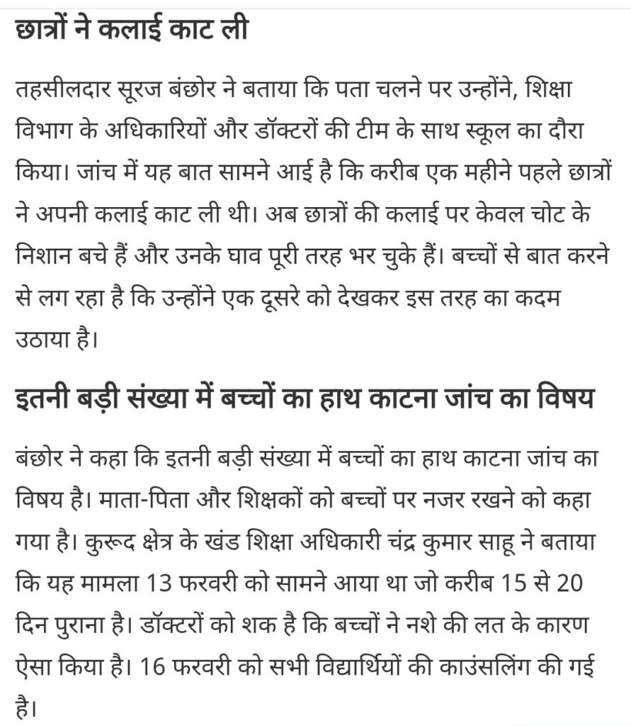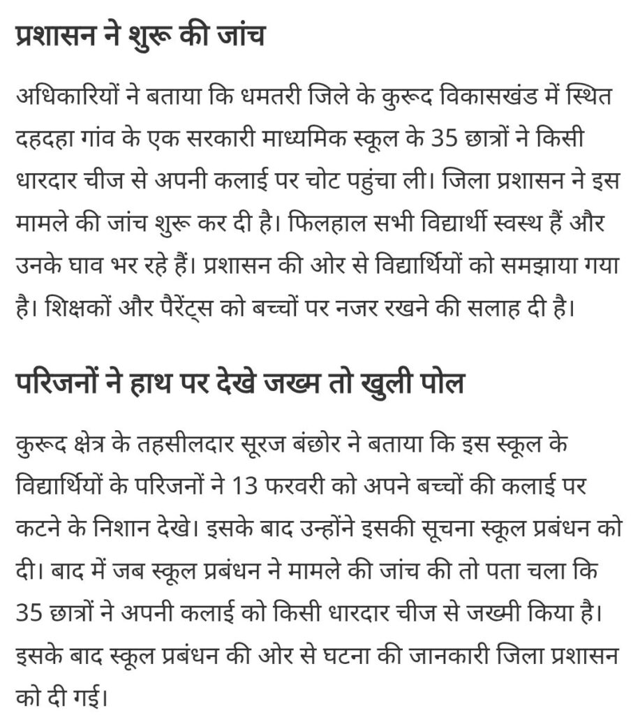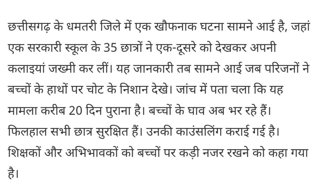 छत्तीसगढ़ के धमतरी जिले के एक सरकारी स्कूल में खौफनाक घटना हुई है। स्कूल के 35 छात्रों ने अपनी कलाइयां काट ली हैं। प्रशासन ने जांच शुरू कर दी है। सभी बच्चे सुरक्षित हैं और उनके घाव भर रहे हैं।
