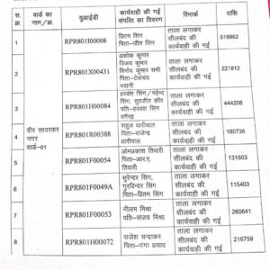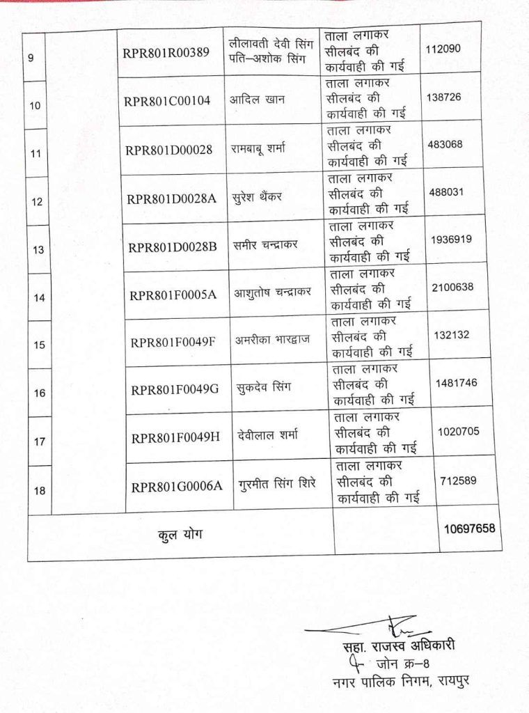 रायपुर। राजधानी में नगर निगम ने संपत्तिकर (टैक्स) नहीं पटाने वाले बड़े बकायादारों पर बड़ी कार्रवाई की है निगम आयुक्त के निर्देश पर जोन 8 में आज टीम ने कई वर्षों से बकाया राशि जमा नहीं करने वाले 18 बड़े बकायादारों के व्यावसायिक परिसरों को ताला लगाकर सीलबंद की कार्रवाई की है नगर निगम आयुक्त ने कहा है कि आगे भी यह कार्रवाई जारी रहेगी।