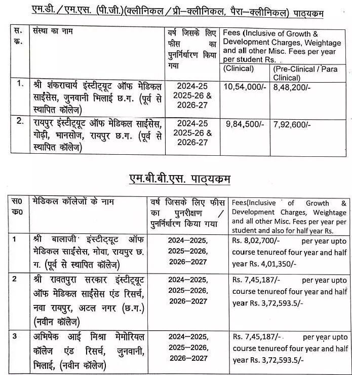 रायपुर। छत्तीसगढ़ मे प्रवेश एवं फीस विनियामक समिति द्वारा तीन डी. फॉर्मेसी कॉलेजो ऋषिकेश इंस्टीट्यूट ऑफ फार्मेसी, सेजबहार,रायपुर,नूपुर कॉलेज ऑफ फार्मेसी, ओल्ड धमतरी रोड, रायपुर एवं श्री बालाजी इंस्टीट्यूट ऑफ फार्मेसी एंड रिसर्च सेंटर, रायपुर के द्वारा फीस निर्धारित न किये जाने और संबंधित विभाग के सचिव और संचालक को इस संबंध में समुचित कार्यवाही हेतु लिखे जाने का निर्णय लिया गया है।