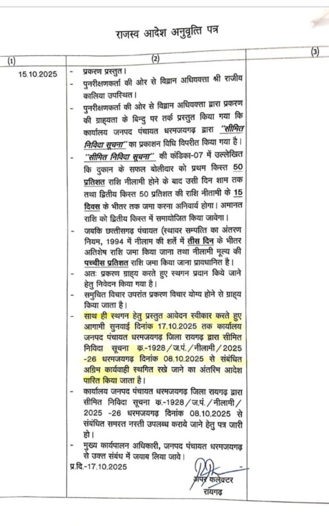 जनपद पंचायत के द्वारा नीलामी किए जाने की प्रक्रिया को न्यायालय में चुनौती देने से लाजमी है की जनपद पंचायत धरमजयगढ़ की छवि धूमिल हुई है और मनमाने ढंग से दुकान की नीलामी करने का मकसद भी अधूरा रह गया है और अब दुकान नीलामी की प्रक्रिया में कई जटिलताएं उत्पन हो गई है। जनपद पंचायत मुख्य पालन अधिकारी के द्वारा अनुसूचित जनजाति क्षेत्र में अनुसूचित जनजातियों के वर्गों को दुकान के नीलामी में भाग लेने से रोकने के लिए कठोर से कठोर नियमों को संयोजित किया गया है और मनमाने शर्ते भी लगाई गई है । एक प्रकार से नीलामी की शर्तों को अनुसूचित जनजाति वर्गों के हितों के विपरीत माना जा सकता है । पुनरीक्षणकर्ता की ओर से श्री राजीव कालिया अधिवक्ता के द्वारा पैरवी की जा रही है ।