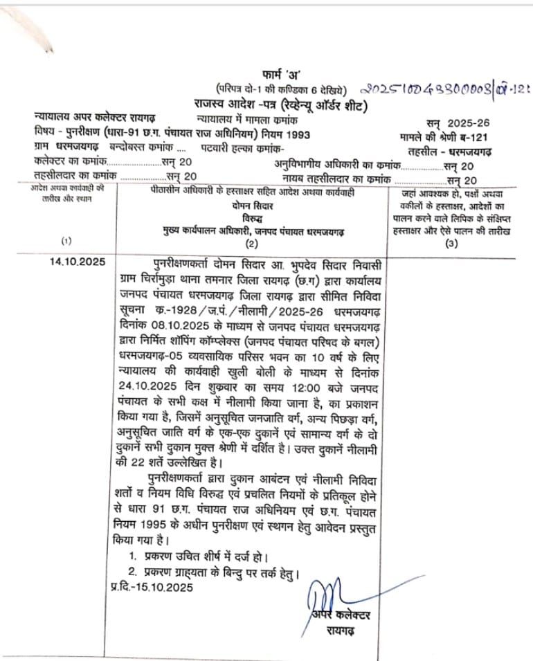 जिसमें मुख्य कार्यपालन अधिकारी जनपद पंचायत धरमजयगढ़ जिला रायगढ़ (छ.ग.) के द्वारा नीलामी के लिए 22 शर्तों को उल्लेखित कर सीमित निविदा सूचना प्रकाशित किया गया है जिसे दोमन सिदार आ. भूपदेव सिदार निवासी चिर्रामुडा़ थाना तमनार जिला रायगढ़ के द्वारा कुछ कठोर शर्तों को विधि विरुद्ध समझते हुए न्यायालय श्रीमान अपर कलेक्टर रायगढ़ जिला रायगढ़ (छ. ग.)के समक्ष चुनौती दिए गई है और पुनरीक्षण प्रकरण प्रस्तुत किया गया ।