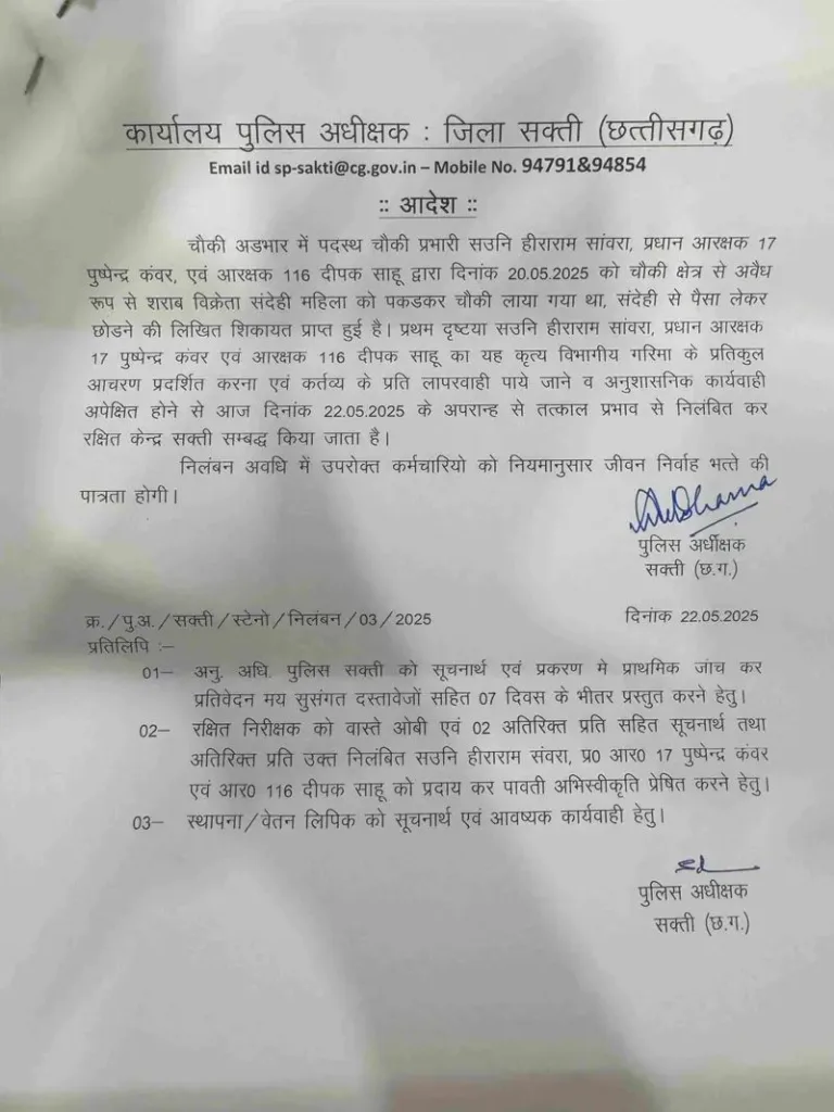 सक्ती।भ्रष्टाचार मामले में एसपी अंकिता शर्मा ने तीन पुलिसकर्मियों को निलंबित किया है,जारी निलंबन आदेश में कहा गया है कि आबकारी के प्रकरण में पैसों के लेन-देन के आरोप पर अडभार चौकी में पदस्थ सहायक उप निरीक्षक (ASI) हीरा राम सावरा, प्रधान आरक्षक पुष्पेन्द्र कंवर और आरक्षक दीपक साहू के खिलाफ निलंबन की कार्रवाई की गई है. एसपी ने मामले की जांच के आदेश भी दिए हैं।
