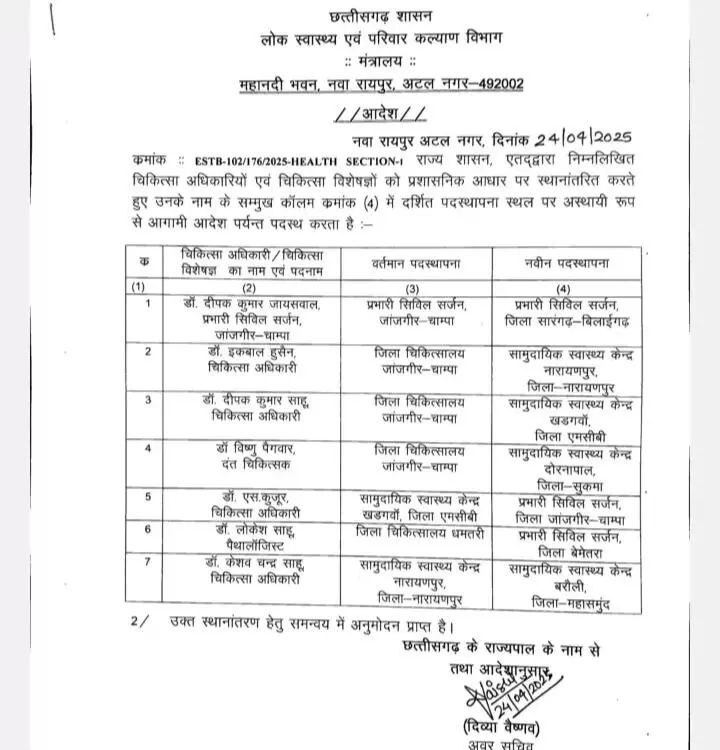डाॅ दीपक कुमार जायसवाल प्रभारी सिविल सर्जन जांजगीर-चांपा को प्रभारी सर्जन सारंगढ़ बिलाईगढ़ भेजा गया है,डाॅ इकबाल हुसैन चिकित्सा अधिकारी जिला चिकित्सालय जांजगीर चांपा से सामुदायिक स्वास्थ्य केंद्र नारायणपुर,डाॅ. दीपक कुमार साहू चिकित्सा अधिकारी जांजगीर चांपा से सामुदायिक स्वास्थ्य केंद्र खडगवों एमसीबी।
