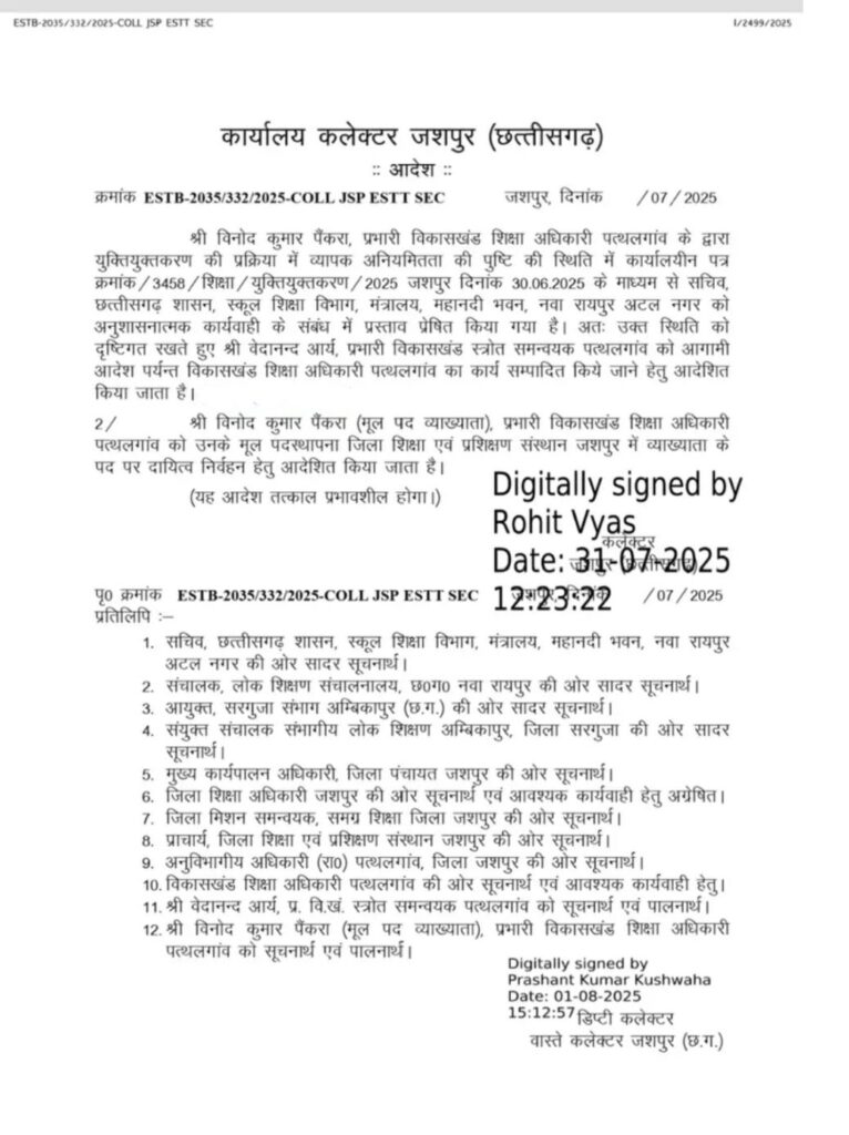 विनोद कुमार पैंकरा, प्रभारी विकासखंड शिक्षा अधिकारी पत्थलगांव के द्वारा युक्तियुक्तकरण की प्रक्रिया में व्यापक अनियमितता की पुष्टि की स्थिति में कार्यालयीन पत्र युक्तियुक्तकरण 2025 जशपुर दिनांक 30.06.2025 के माध्यम से सचिव, छत्तीसगढ़ शासन, स्कूल शिक्षा विभाग, मंत्रालय, महानदी भवन,नवा रायपुर अटल नगर को अनुशासनात्मक कार्यवाही के संबंध में प्रस्ताव प्रेषित किया गया है।