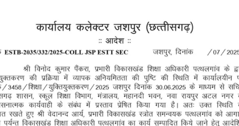 Cg News : कलेक्टर ने पत्थलगांव के प्रभारी BEO विनोद पैंकरा को हटाया..