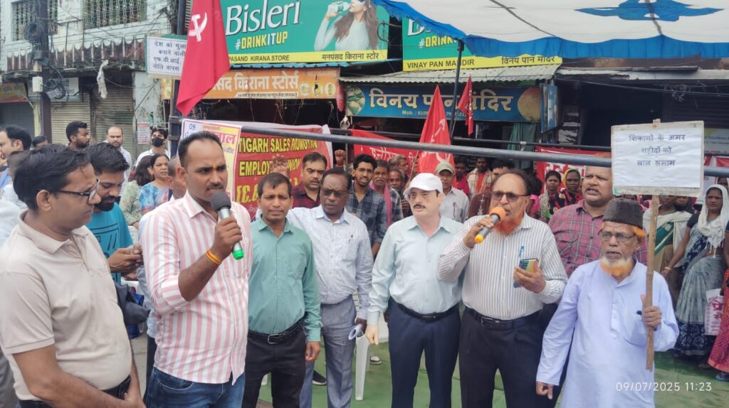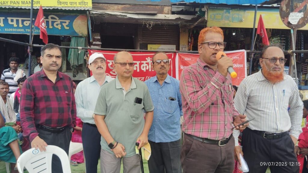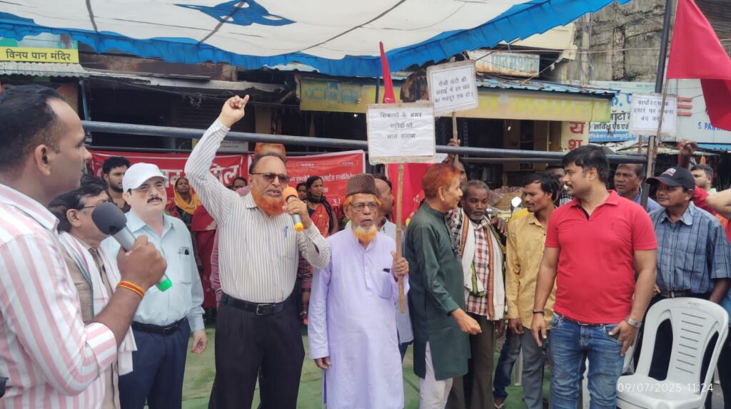 रायगढ़।ट्रेड यूनियन काउंसिल रायगढ़ के उपाध्यक्ष शेख कलीमुल्लाह सचिव श्याम जायसवाल ने बताया कि 9 जुलाई को संयुक्त ट्रेड यूनियन काउंसिल के आह्वान पर आज पूरे देश में 17 सूत्री मांगों के समर्थन में लोग सड़कों पर उतरे, धरना प्रदर्शन और हड़ताल किया. रायगढ़ भी इससे अछूता नहीं रहा. ट्रेड यूनियन काउंसिल के आह्वान पर बिरादराना संगठन के सैकड़ो सदस्यों ने स्थानीय जीवन बीमा निगम कार्यालय सक्ति गुड़ी चौक पर प्रातः 10:00 बजे से 1:00 बजे तक धरना प्रदर्शन कर केंद्र सरकार की जन विरोधी नीतियों का जमकर विरोध किया . धरना प्रदर्शन में 17 सूत्री मांगे जिंदाबाद, श्रम संहिता वापस लो,निजीकरण की नीति नहीं चलेगी, सार्वजनिक क्षेत्र की रक्षा करो, न्यूनतम वेतन और रोजगार सुरक्षा दो, ठेका पद्धति समाप्त करो, सार्वजनिक सेवाओं संसाधनों की रक्षा करो, रोजगार सृजन और सामाजिक सुरक्षा सुनिश्चित करो, सामाजिक सदभाव की रक्षा करो, वित्तीय बैंकिंग क्षेत्र से जुड़ी विशेष मांगों को पूरी करो, मजदूरों के मूल अधिकार की रक्षा करो, महंगाई पर नियंत्रण करो, आर्थिक न्याय स्थापित करो, जीवन रक्षक दवाओं की मूल्यों को नियंत्रित करो जैसे नारे लगाए गए।