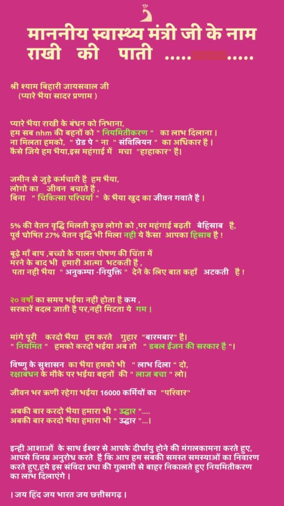 रायगढ़।जिले के राष्ट्रीय स्वास्थ्य मिशन (एन.एच.एम. के कर्मचारी, विशेष रूप से हमारी मेहनती बहनें, एक बार फिर अपनी 20 वर्षों से लंबित मांगों को लेकर सड़कों पर उतरने को मजबूर हैं। ये कर्मचारी, जो स्वास्थ्य सेवाओं की रीढ़ हैं, अपनी 10 सूत्रीय मांगों को लेकर प्रधानमंत्री और मुख्यमंत्री को पत्र लिखकर ‘‘मोदी की गारंटी‘‘ की याद दिला रहे हैं। 155 से अधिक बार ज्ञापन और निवेदन सौंपने के बावजूद, उनकी आवाज अनसुनी रही है। अब, 18 अगस्त 2025 से, ये कर्मचारी अनिश्चितकालीन हड़ताल पर जाने को तैयार हैं।