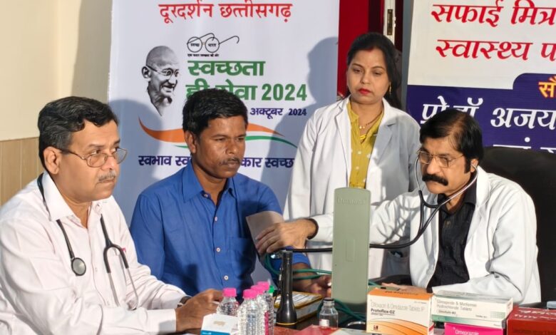 रायपुर।स्वच्छ भारत अभियान और 17 सितंबर से 2 अक्टूबर तक चलने वाले “स्वच्छता ही सेवा 2024” पखवाड़े के तहत डॉ अजय सहाय एवं उनकी टीम द्वारा सफाई कर्मियों के स्वास्थ्य परीक्षण के लिए दूरदर्शन केन्द्र रायपुर में एक विशेष शिविर का आयोजन किया गया इस शिविर में सफाई कर्मियों के अलावा केंद्र के अधिकारियों एवं कर्मचारियों का भी स्वास्थ्य परीक्षण किया गया। सम्पूर्ण चेकअप के साथ साथ सभी की ईसीजी एवं ब्लड शुगर जांच भी की गई। आवश्यकतानुसार दवाइया भी निःशुल्क प्रदान की गईं।