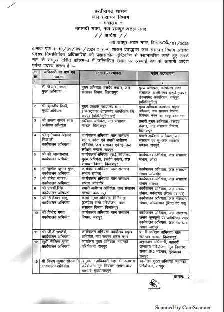 जारी आदेश के अनुसार, जल संसाधन विभाग ने 14 अधिकारियों का ट्रांसफर किया है. इनमें जे. आर. भगत, कुलदीप तिर्की, अरुण कुमार साय, इम्तियाज अहमद सिद्धीकी, डी. जायसवाल, सुशील कुमार गुप्ता, होमेश नायक, एन.सी. सिंह, खिलेश्वर साहू, विनोद भगत, जी.डी. रामटेके, नीलिमा गुप्ता, विजय कुमार सोनवानी और शिवनारायण साय , पीके वासनिक, महेन्द्र कुमार शांडिल्य और वीपी वर्मा को नई जिम्मेदारी सौंपी गई है।