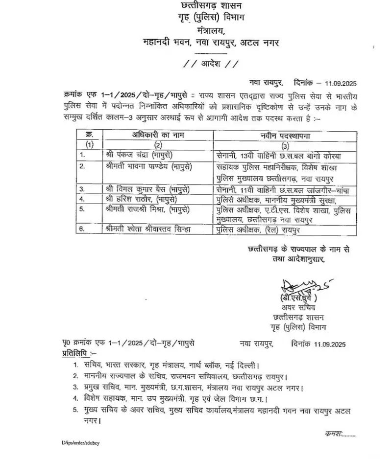 छत्तीसगढ़।प्रशासनिक फेरबदल के तहत आईपीएस अधिकारियों के तबादले का आदेश जारी कर दिया गया है गृह विभाग (पुलिस) के अवर सचिव द्वारा जारी आदेश में कुल छह आईपीएस अधिकारियों के नाम शामिल हैं,यह तबादला राज्य में पुलिस प्रशासन को अधिक प्रभावी, गतिशील और जवाबदेह बनाने के उद्देश्य से किया गया है।