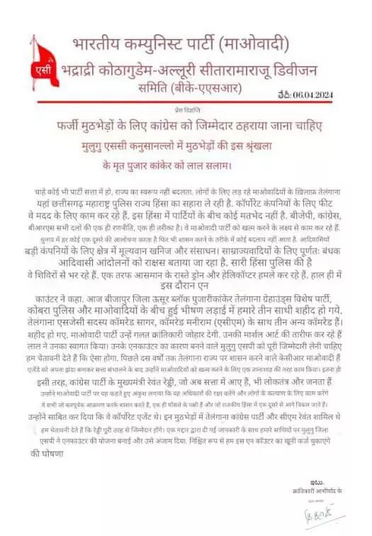 भद्राद्री कोठागुडेम, अल्लूरी सीता रामराजू डिवीज़न समिति (बीके-एएसआर )के द्वारा जारी विज्ञप्ति में कहा गया है कि चाहे कोई भी पार्टी सत्ता में हो राज्य का स्वरूप नहीं बदलता, लोगों के लिए लड़ रहे माओवादियों के खिलाफ तेलंगाना सरकार,छत्तीसगढ़ महाराष्ट्र राज्य से पुलिस का सहारा ले रही है,वहीं कॉरपोरेट कम्पनियों के लिए मदद कर रही है। इस हिंसा में पार्टियों में कोई मतभेद नहीं हैं,आगे लिखा गया है कि बीजेपी,कांग्रेस और बीआरएस सभी दलों की एक ही राजनीती एक ही तरीका है,ये माओवादी पार्टी को खत्म करने के लिए काम कर रहे हैं।