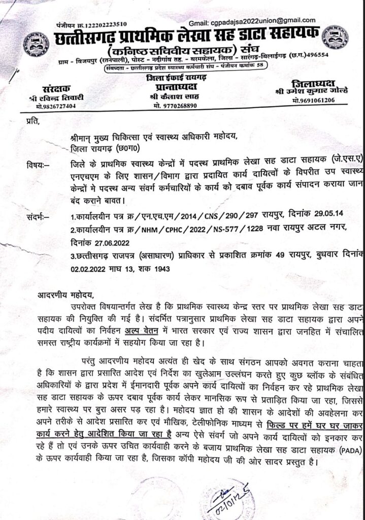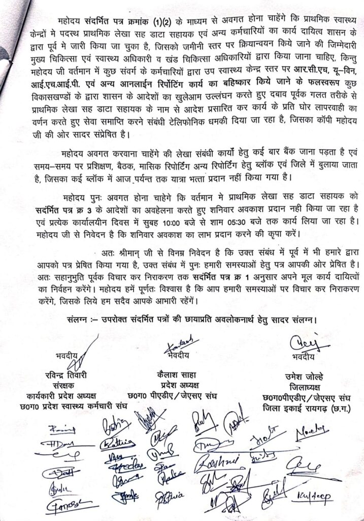 रायगढ़।छत्तीसगढ़ प्राथमिक लेखा सह डाटा सहायक-कनिष्ठ सचिवीय संघ, अपनी समस्याओं एवं मांगो को लेकर, अपनी कार्यस्थल पर होनी वाली समस्याओं के संबंध मे मुख्य चिकित्सा एवं स्वास्थ्य अधिकारी जिला रायगढ़ तथा जिला कार्यक्रम प्रबंधक-एन.एच.एम. को अवगत कराया गया, जिसमें अधिकारियों द्वारा उनके समस्याओं को सुनते हुए सहानुभूति पूर्वक समस्या का निवारण करने हेतु कहा गया, जिसमें छत्तीसगढ़ प्रदेश स्वास्थ्य कर्मचारी संघ के कार्यकारी अध्यक्ष रविंद्र तिवारी, जिलाध्यक्ष लीलाधर नायक, ओमप्रकाश पटेल का विशेष सहयोग रहा एवं छत्तीसगढ़ लेखा सह डाटा सहायक संघ के प्रदेश अध्यक्ष कैलाश साहा, प्रांतीय संयोजक हरीश कुमार पटेल, जिलाध्यक्ष उमेश जोल्हे एवं जिला रायगढ़ के सभी सक्रिय सदस्यगण उपस्थित रहे।