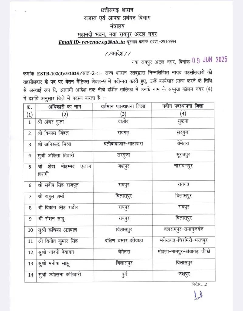 Cg News : 40 नायब तहसीलदारों का प्रमोशन, नई पोस्टिंग के आदेश जारी…