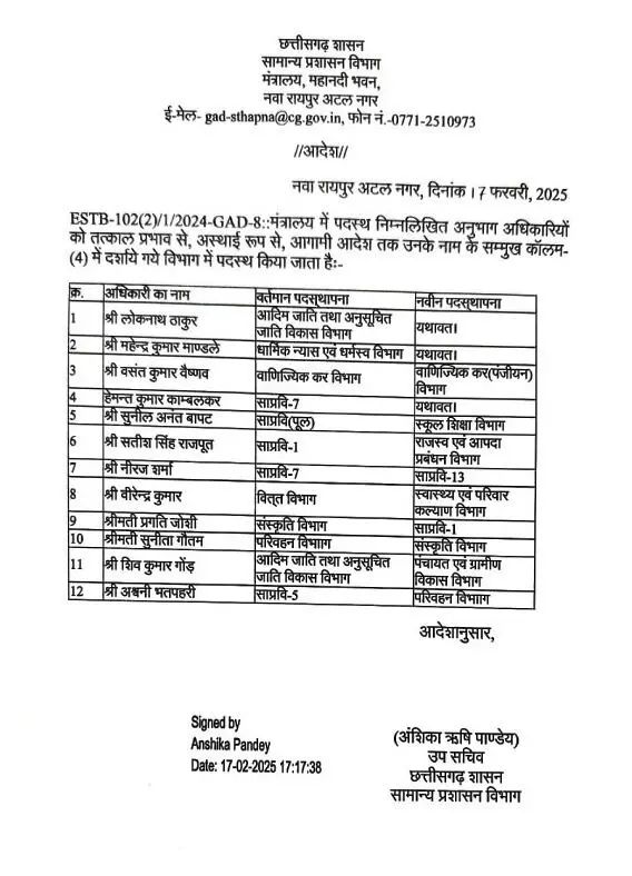 रायपुर। राज्य शासन ने सोमवार को मंत्रालय में पदस्थ कई अनुभाग अधिकारियों की पदस्थापना आदेश जारी किया है, सूची में 12 अधिकारियों के नाम शामिल है।