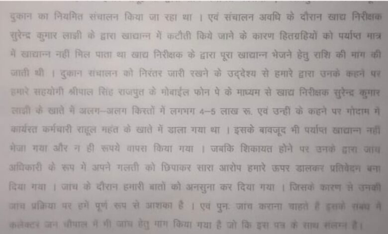 दुकान संचालन को निरंतर जारी रखने के उद्देश्य से हमारे द्वारा उनके कहने पर हमारे सहयोगी श्रीपाल सिंह राजपूत के मोबाईल फोन पे के माध्यम से खाद्य निरीक्षक सुरेन्द्र कुमार लांझी के खाते में अलग-अलग किस्तों में लगभग 4-5 लाख रू. एवं उन्ही के कहने पर गोदाम में कार्यरत कर्मचारी राहुल महंत के खाते में डाला गया था। इसके बावजूद भी पर्याप्त खाद्यान्न नहीं भेजा गया और न ही रूपये वापस किया गया। जबकि शिकायत होने पर उनके द्वारा जांच अधिकारी के रूप में अपने गलती को छिपाकर सारा आरोप समूह के ऊपर डालकर प्रतिवेदन बना दिया गया। जांच के दौरान हमारी(समूह की) बातों को अनसुना कर दिया गया। जिसके कारण से उनकी जांच प्रक्रिया पर समूह को पूर्ण रूप से आशंका है। एवं पुनः जांच कराना चाहते हैं। समूह ने राशि भेजने का प्रमाण देते हुए पाली एसडीएम से उनके न्यायालय द्वारा जारी कार्यवाही पर विराम लगाते हुए निरीक्षक सुरेन्द्र कुमार लांझी की भ्रष्ट गतिविधियों की जांच कराने का आग्रह किया है।मामले में खाद्य निरीक्षक की प्रतिक्रिया फ़िलहाल नहीं मिल सका है।