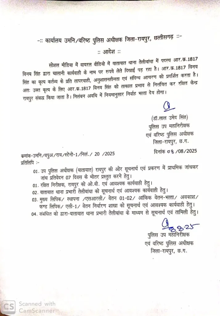 जानकारी के अनुसार, तेलीबांधा थाना क्षेत्र में पदस्थ सहायक उप निरीक्षक परमेश्वर चौधरी,आरक्षक शिवकांत मिश्रा और आरक्षक विनय सिंह का एक वीडियो सोशल मीडिया पर तेजी से वायरल हुआ था। वीडियो में तीनों को चालानी कार्रवाई के दौरान रुपये लेते हुए स्पष्ट रूप से देखा जा सकता है।