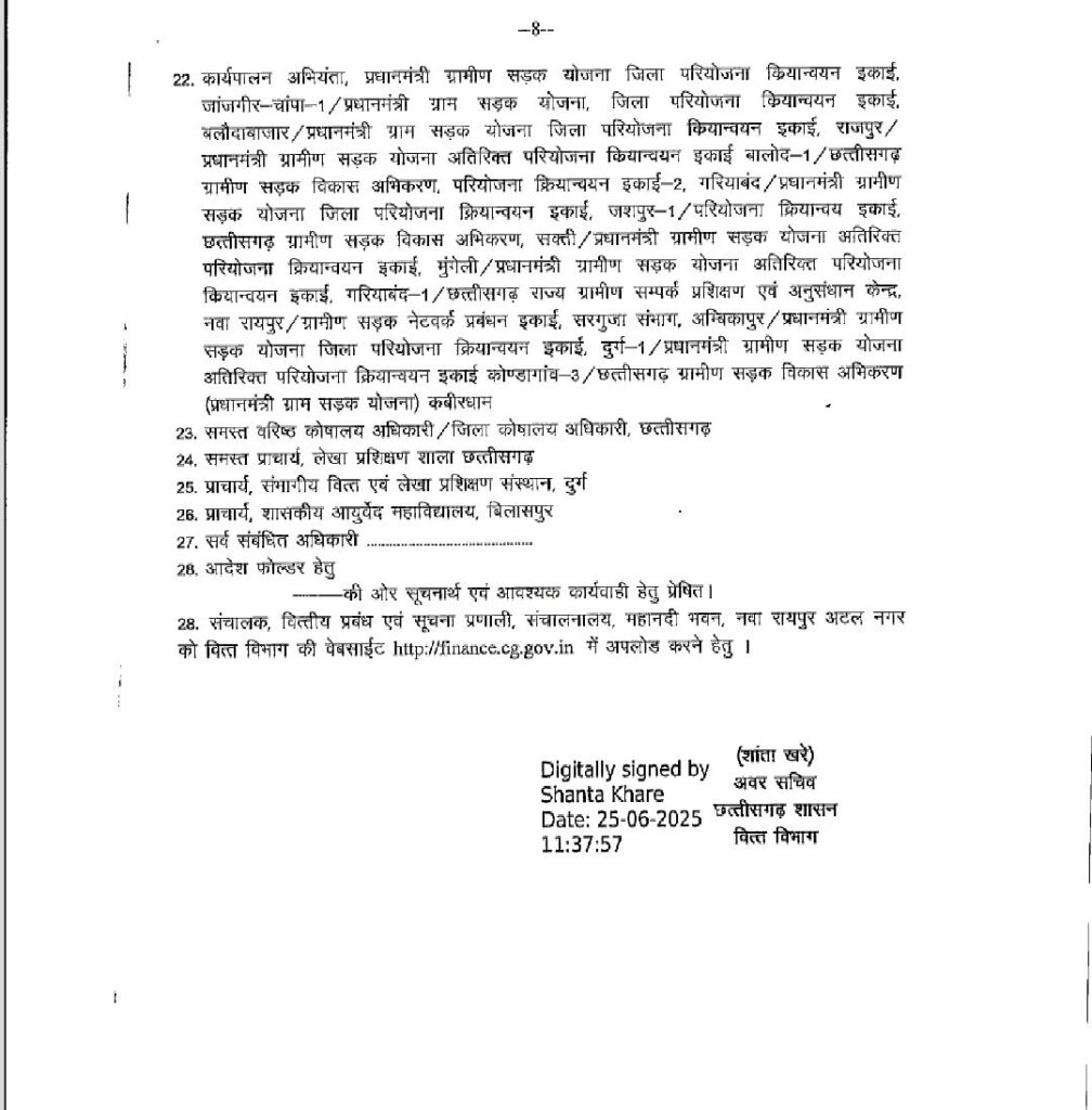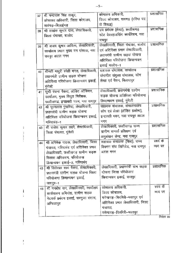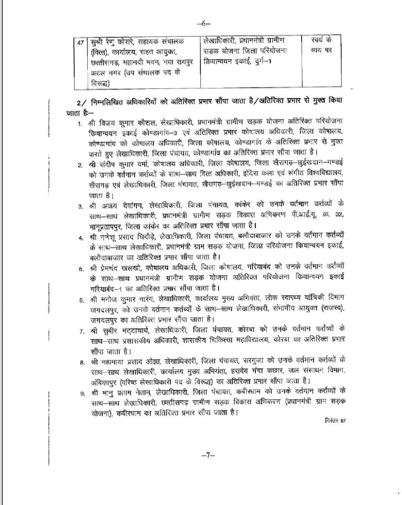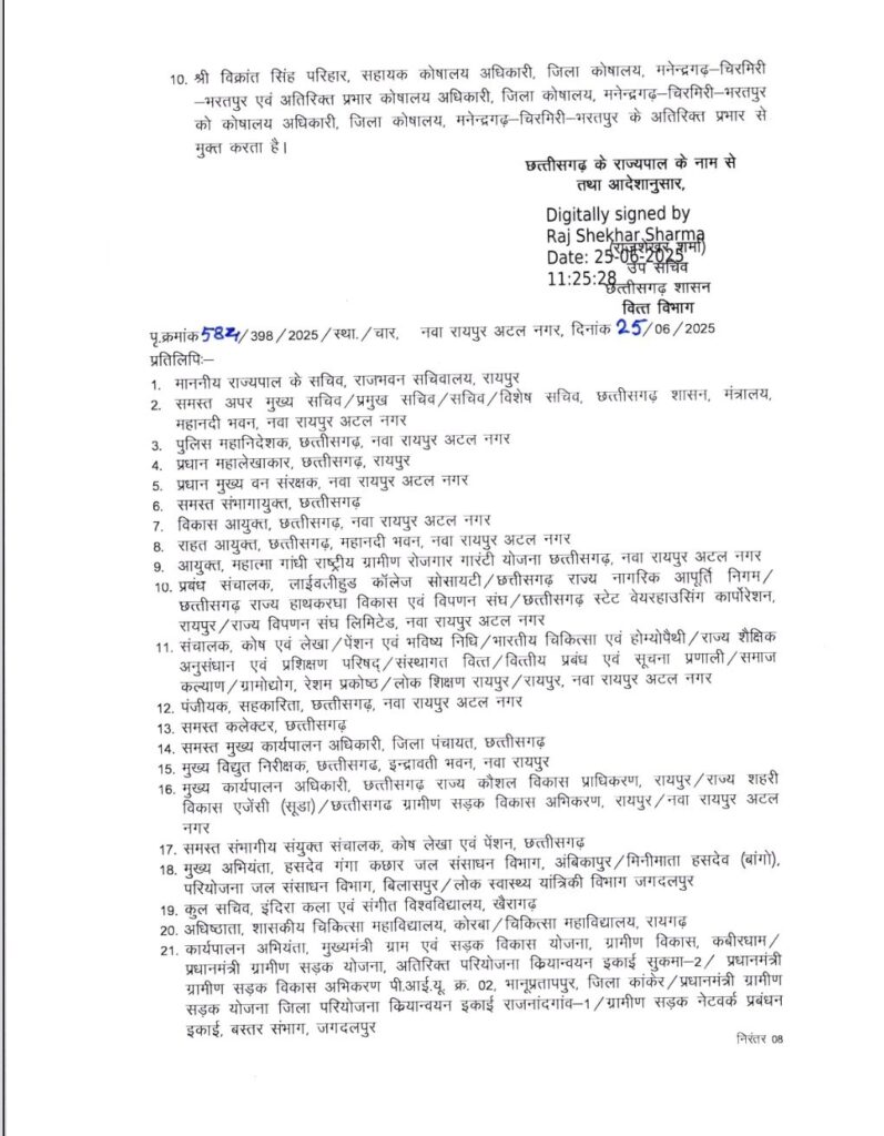 आदेश में संबंधित अधिकारियों को शीघ्र नवीन पदस्थापना स्थल पर कार्यभार ग्रहण करने के निर्देश दिए गए हैं सूत्रों के अनुसार तबादला सूची में विभाग के कई वरिष्ठ और अनुभवी अधिकारी शामिल हैं।