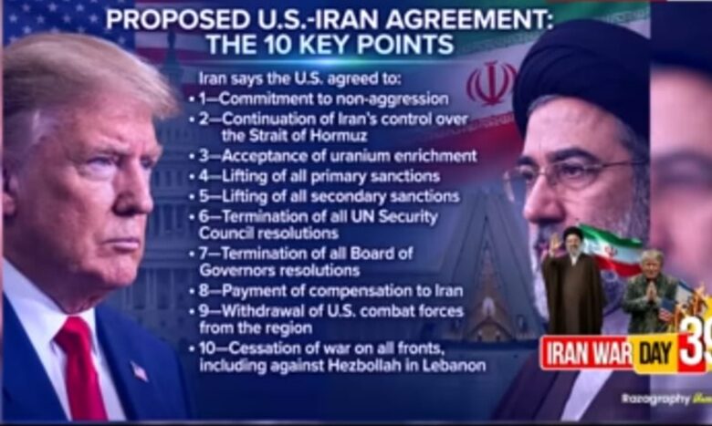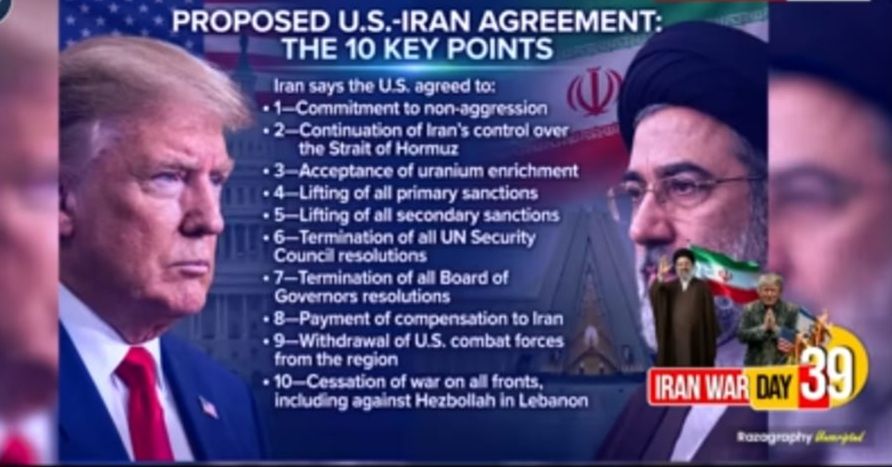 ईरान ने 10-सूत्रीय मांग पर बातचीत को स्वीकार किए जाने को अपनी बड़ी जीत बताया है। ईरान की सरकारी तस्नीम न्यूज एजेंसी ने सर्वोच्च राष्ट्रीय सुरक्षा परिषद का बयान प्रकाशित किया है। इसमें कहा गया है कि ईरान ने एक महान जीत हासिल की और अपराधी अमेरिका को अपनी ’10 सूत्रीय योजना को स्वीकार करने के लिए मजबूर’ कर दिया। इसके साथ ही 10 सूत्रीय मांगों की जानकारी भी दी गई है, जिसके आधार पर ईरान ने बातचीत की मांग की है।