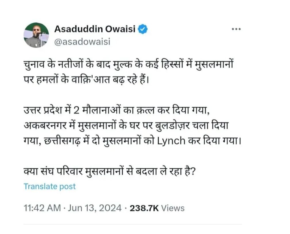 देश।सांसद असदुद्दीन ओवैसी ने RSS और बीजेपी पर आरोप लगाते हुए ट्वीटर वर्तमान X में पोस्ट किया है की चुनाव के नतीजों के बाद मुल्क के कई हिस्सों में मुसलमानों पर हमलों के वाक़ि’ आत बढ़ रहे हैं। उत्तर प्रदेश में 2 मौलानाओं का क़त्ल कर दिया गया,अकबरनगर में मुसलमानों के घर पर बुलडोज़र चला दिया गया,छत्तीसगढ़ में दो मुसलमानों को Lynch कर दिया गया। ओवैसी ने कहा क्या संघ परिवार मुसलमानों से बदला ले रहा है?