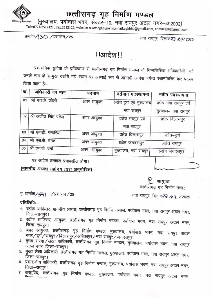 रायपुर। गृह निर्माण मंडल मे पांच अपर आयुक्त के तबादले किए हैं।