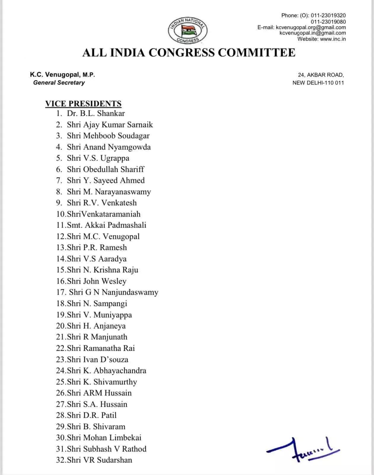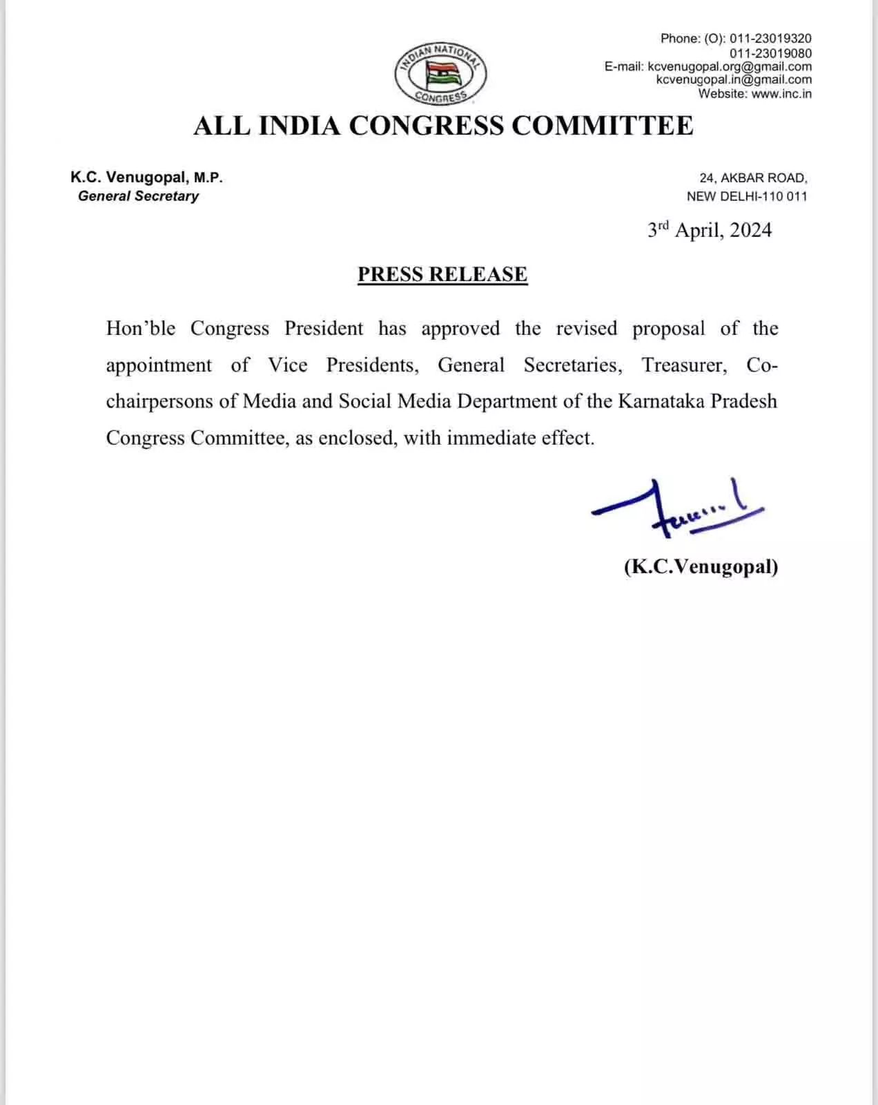 नई दिल्ली। कांग्रेस अध्यक्ष ने कर्नाटक प्रदेश कांग्रेस कमेटी के मीडिया और सोशल मीडिया विभाग के उपाध्यक्षों, महासचिवों, कोषाध्यक्ष, सह-अध्यक्षों की नियुक्ति के संशोधित प्रस्ताव को तत्काल प्रभाव से मंजूरी दे दी है।