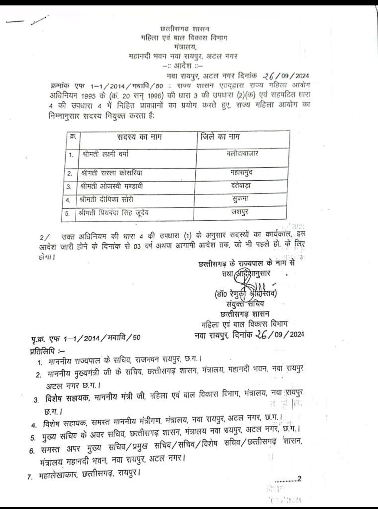बता दें, जिन 5 सदस्यों की राज्य महिला आयोग में की नियुक्ति गई है, उनमें बलौदाबाजार जिले से लक्ष्मी वर्मा, महासमुंद से सरला कोसरिया, दंतेवाड़ा से ओजस्वी मण्डावी, सुकमा से दीपिका सोरी और जशपुर से प्रियबंदा सिंह जुदेव शामिल हैं.