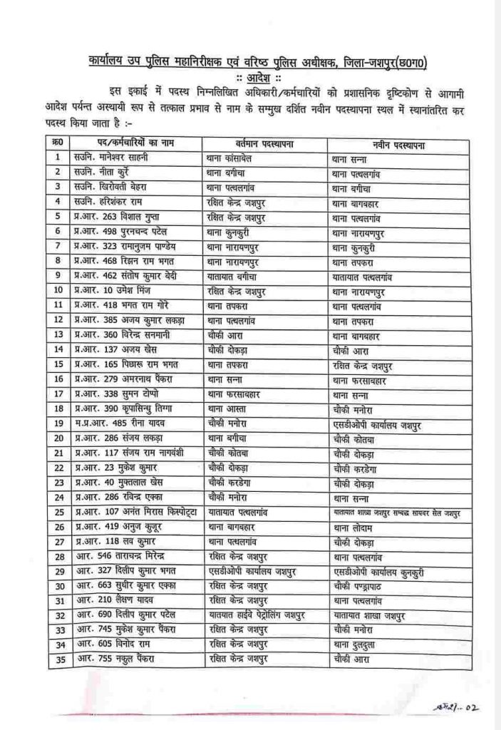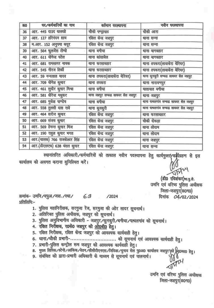 जशपुर।प्रशासनिक कसावट लाने थोक में पुलिस कर्मियों का तबादला किया गया है. पुलिस अधीक्षक जशपुर ने आदेश जारी कर चार ASI, 23 प्रधान आरक्षक सहित 27 आरक्षकों काे इधर से उधर किया है।