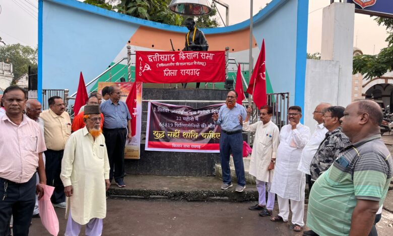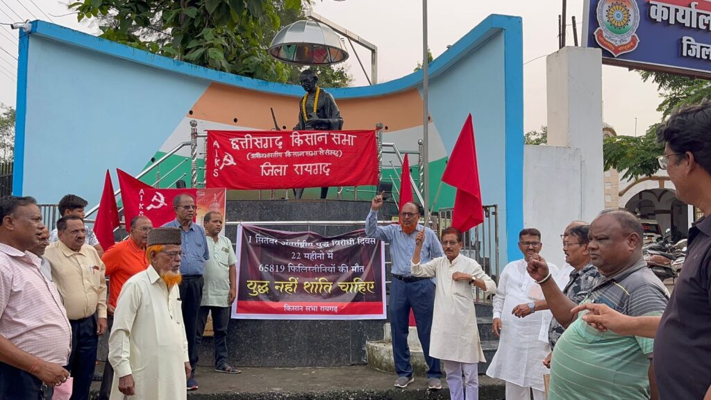 रायगढ़।1 सितम्बर को अंतर्राष्ट्रीय युद्ध विरोधी दिवस मनाया जाता है.इस समय युक्रेन-रूस और फिलिस्तीन – इजराइल के बीच युद्ध जारी है. युद्ध मे हजारों निर्दोष नागरिकों की मौत हुई है. इजराइल ने तो तमाम हदे पार कर दी है. फिलिस्तीन में अंतर्राष्ट्रीय राहत सामग्री जाने नहीं दे रहा है वहां भुखमरी के सबसे ज्यादा शिकार बच्चे हो रहे है.गाजा मे इजराइल की ओर से गत 22 महीनो से किये जा रहे हमलों अब तक 62 हजार 819 फिलिस्तिनियों की जान जा चुकी है. आज दुनिया का हर नागरिक युद्ध को लेकर चिंतीत है. छत्तीसगढ़ का रायगढ़ भी इस चिंता से अछूता नहीं है.छ. ग. किसान सभा रायगढ़ इकाई ने 1सितंबर को 4 बजे गाँधी प्रतिमा के पास युद्ध के विरोध में सांकेतिक प्रदर्शन आयोजित किया।