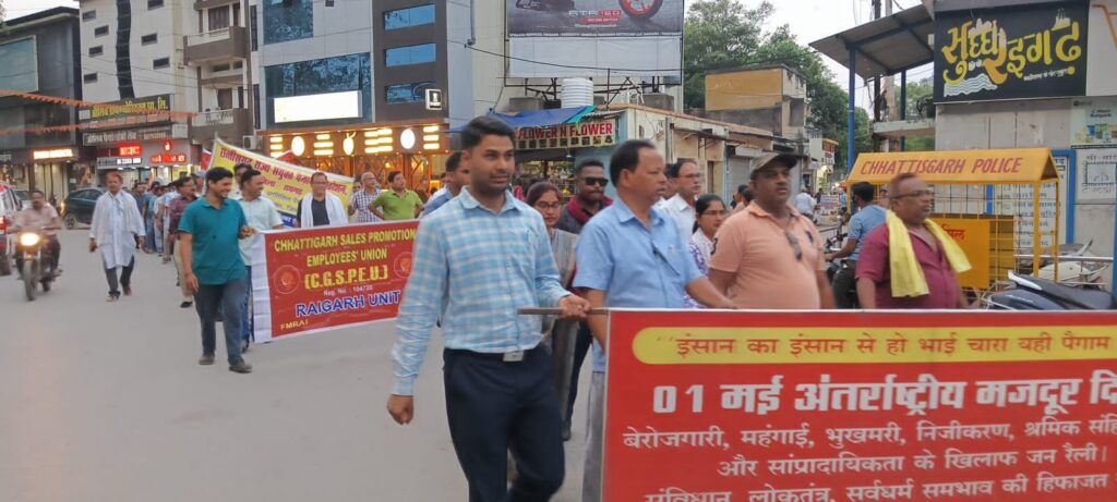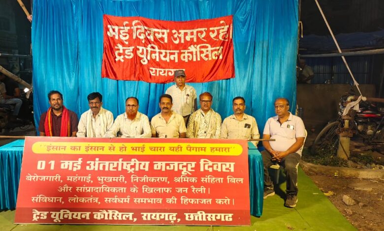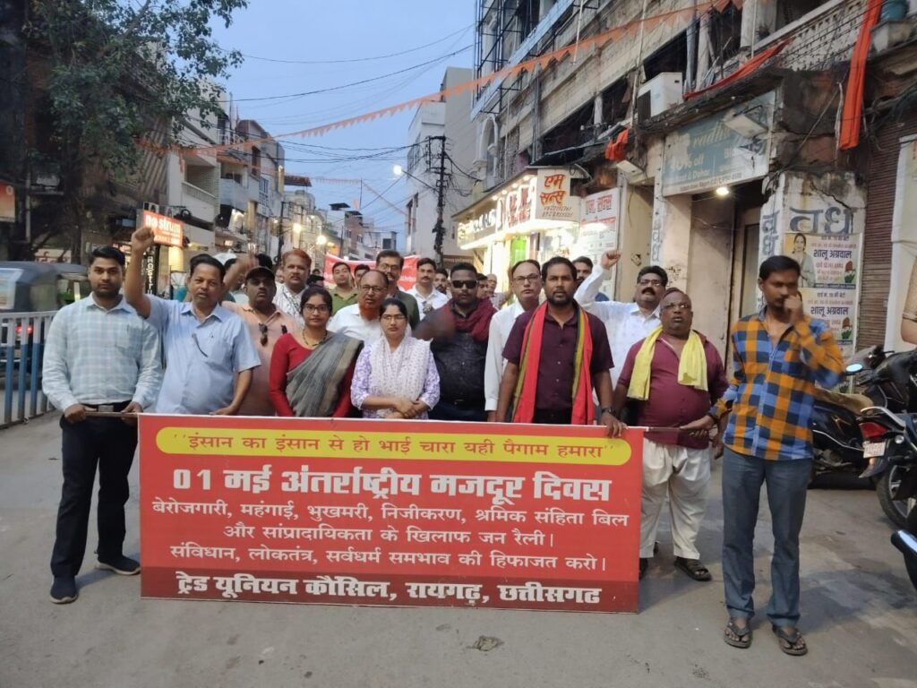 रायगढ़।ट्रेड यूनियन काउंसिल द्वारा 1मई अंतर्राष्ट्रीय मजदूर दिवस के अवसर पर स्थानीय सत्ती गुड़ी चौक में शाम 5 बजे रैली निकली गई जो शहर के सिविल लाइन स्टेशन चौक गांधी चौक सुभाष चौक गद्दी चौक हटरी चौक थाना रोड हंडी चौक होते हुए वापस सत्ती गुड़ी चौक पहुंचा, और रैली आमसभा में तब्दील हो गयी. रैली में मजदूर दिवस अमर रहे, शिकागो के शहीदों को लाल सलाम, बढ़ती महंगाई पर रोक लगाओ, बढ़ती बेरोजगारी पर रोक लगाओ, जीवन रक्षक दवाओं की कालाबाजारी नहीं चलेगी,हर हाथ को काम देना होगा, निजीकरण मुर्दाबाद, सार्वजनिक उपकर्मों को बेचना बंद करो, निजीकरण की नीति नहीं चलेगी, श्रम संहिता में बदलाव नहीं चलेगी आदि नारे लगाए गए. सिटी कोतवाली के समीप जिला बचाओ संघर्ष मोर्चा के द्वारा रैली में शामिल लोगों को पानी एवं कोल्ड ड्रिंक वितरित कर रैली में शामिल लोगों का उत्साहवर्जन किया गया।