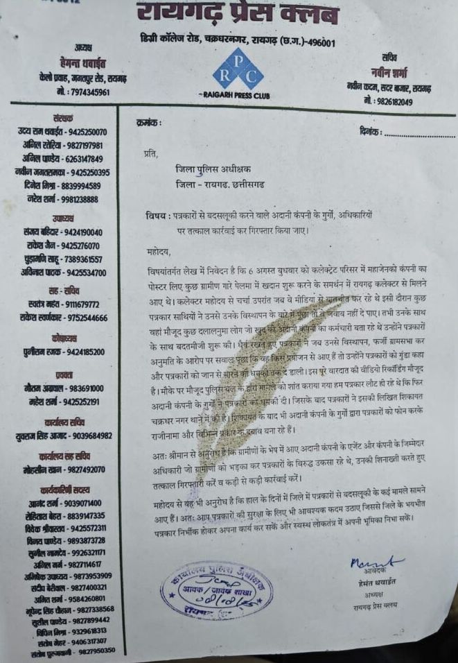 शुक्रवार शाम को प्रेस क्लब अध्यक्ष हेमंत थवाईत की अगुवाई में 80 से अधिक पत्रकार पुलिस अधीक्षक दिव्यांग पटेल से मिलने पहुंचे। जहां उन्होंने एसपी को बताया कि 6 अगस्त बुधवार को कलेक्ट्रेट परिसर में महाजेनको कंपनी का पोस्टर लिए कुछ ग्रामीण गारे पेलमा में खदान शुरू करने के समर्थन में रायगढ़ कलेक्टर से मिलने आए थे। कलेक्टर से चर्चा उपरांत जब वे मीडिया से बातचीत कर रहे थे इसी दौरान कुछ पत्रकार साथियों ने उनसे उनके विस्थापन के बारे में पूछा तो वे जवाब नहीं दे पाए। तभी उनके साथ वहां मौजूद कुछ दलालनुमा लोग जो खुद को अदानी कंपनी का कर्मचारी बता रहे थे उन्होंने पत्रकारों के साथ बदतमीजी शुरू की। धैर्य रखते हुए पत्रकारों ने जब उनसे विस्थापन, फर्जी ग्रामसभा कर अनुमति के आरोप पर सवाल पूछा कि वह किस प्रयोजन से आए हैं तो उन्होंने पत्रकारों को गुंडा कहा और पत्रकारों को जान से मारने की धमकी तक दे डाली। इस पूरे वारदात की वीडियो रिकॉर्डिंग मौजूद है। मौके पर मौजूद पुलिस बल के द्वारा मामले को शांत कराया गया हम पत्रकार लौट ही रहे थे कि फिर अदानी कंपनी के गुर्गों ने पत्रकारों को धमकी दी। जिसके बाद पत्रकारों ने इसकी लिखित शिकायत चक्रधर नगर थाने में की है। शिकायत के बाद भी अदानी कंपनी के गुर्गों द्वारा पत्रकारों को फोन करके राजीनामा और विभिन्न प्रकार के दबाव बना रहे हैं।