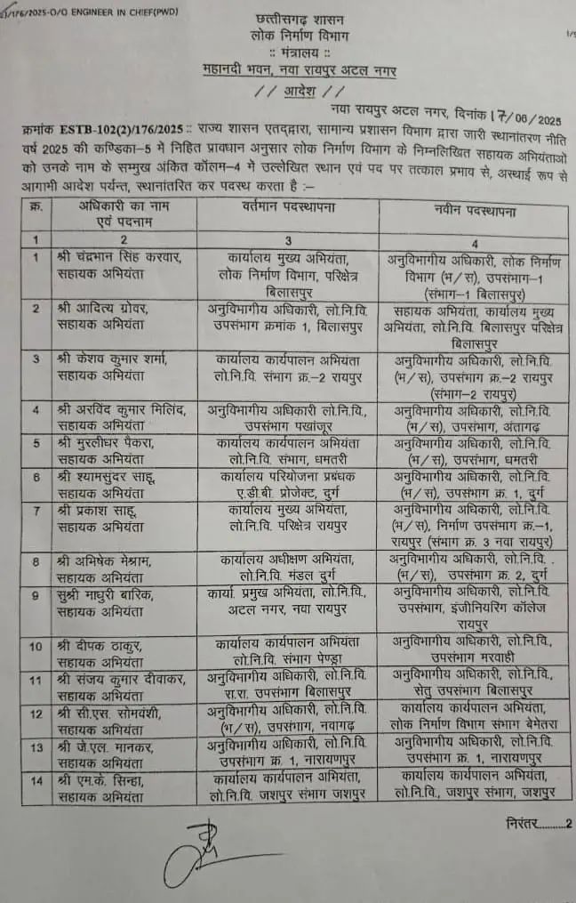 Cg News : लोक निर्माण विभाग में अधिकारी कर्मचारी की नवीन पदस्थापना…