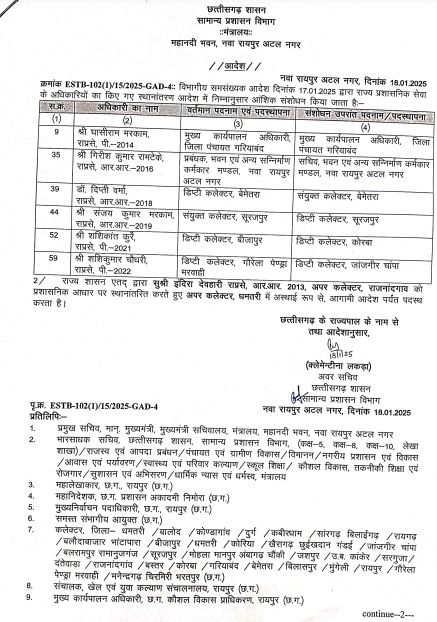 संशोधित आदेश में 2014 बैच के राप्रसे के अधिकारी घासीराम मरकाम को गरियाबंद जिला पंचायत के मुख्य कार्यपालन अधिकारी के पद से नहीं हटाया गया है. गिरीश कुमार रामटेके को प्रबंधक, भवन एवं अन्य निर्माण कर्मकार मंडल, नवा रायपुर अटल नगर से सचिव, भवन एवं अन्य निर्माण कर्मकार मंडल, नवा रायपुर अटल नगर में पदस्थापना दी गई है. वहीं शशिकांत कुर्रे को कोरबा का डिप्टी कलेक्टर बनाया गया है.