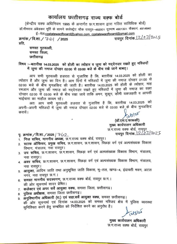लेकिन इस बीच छत्तीसगढ़ वक्फ बोर्ड ने बड़ा फैसला लिया है मिली जानकारी के अनुसार छत्तीसगढ़ वक्फ बोर्ड ने होली पर जुमे की नमाज को लेकर बड़ा फैसला लिया है वक्फ बोर्ड के अध्यक्ष डॉ सलीम राज ने निर्देश जारी करते हुए कहा है कि शुक्रवार को मस्जिदों में जुमे की नमाज के समय में बदलाव किया गया है उन्होंने कहा कि मस्जिदों में जुमे की नमाज दोपहर 12 बजे के बजाए 2 से 3 बजे तक होगी। उन्होंने बताया कि ये फैसला आपसी भाई चारे की भावना को बरकरार रखने के लिया गया है।