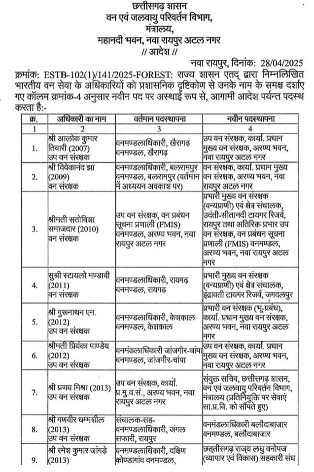 रायपुर। छत्तीसगढ़ में वन विभाग के 35 अधिकारियों के तबादले किए गए हैं खैरागढ़ और बलरामपुर डीएफओ भी बदले गए हैं वन एवं जलवायु परिवर्तन विभाग ने आदेश जारी कर दिया है।