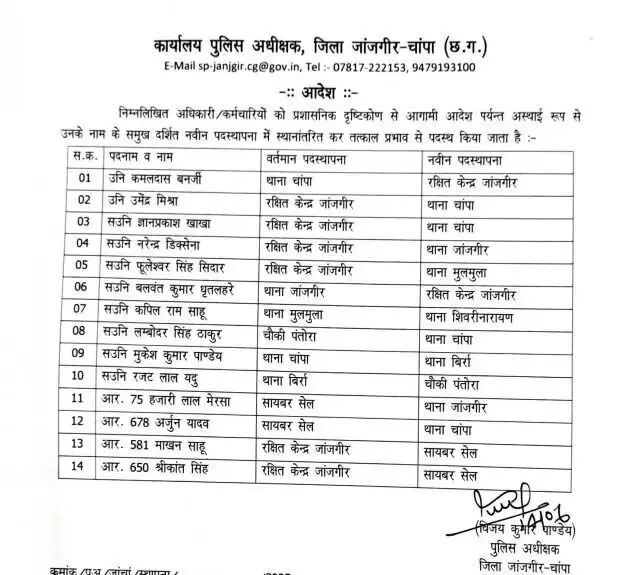 जांजगीर-चांपा। छत्तीसगढ़ के जांजगीर जिले में एसपी विजय कुमार पाण्डेय ने कई थानों में पदस्थ पुलिसकर्मियों को इधर से उधर किया है,सूची में दो एसआई,आठ एएसआई, चार आरक्षक के नाम शामिल है।