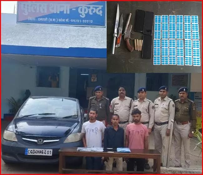 आरोपियों के विरुद्ध थाना कुरूद में अप.क्र.44/25 धारा 22 (ख) नारकोटिक एक्ट एवं धारा 25 आर्म्स एक्ट के तहत अपराध पंजीबद्ध कर,तीनों आरोपियों को विधिवत गिरफ्तार कर न्यायिक रिमाण्ड पर भेजी जा रही है। आरोपियों का नाम- टिकेन्द्र साहू उर्फ टिल्लू पिता लक्ष्मीराम साहू उम्र 18 वर्ष 11 माह, साकिन इंद्रानगर कुरूद,थाना कुरूद जिला धमतरी(छ.ग.) जयप्रकाश उर्फ गोलू पिता लक्ष्मीराम साहू उम्र 23 वर्ष साकिन इंद्रानगर कुरूद,थाना कुरूद जिला धमतरी(छ.ग.) गुलशन साहू पिता ओमप्रकाश साहू उम्र 18 वर्ष 01 माह साकिन कुहकुहा,थाना कुरूद जिला धमतरी(छ.ग.)