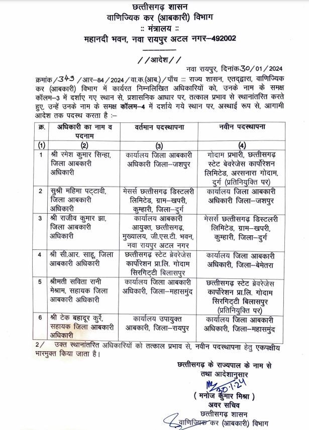 रायपुर।छत्तीसगढ़ शासन के वाणिज्य कर (आबकारी) विभाग के अधिकारियों की तबादला सूची जारी की गई है।